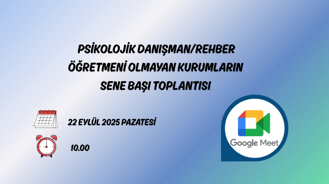 Sorumluluk bölgemizde bulunan Demirci, Köprübaşı, Gördes ve Selendi ilçelerinde rehber öğretmeni/psikolojik danışmanı olmayan (özel ve devlet) eğitim kurumları idarecileri için 22 Eylül 2025 Pazartesi saat 10.00’da GOOGLE MEET üzerinden sene başı toplantısı düzenlenecektir.